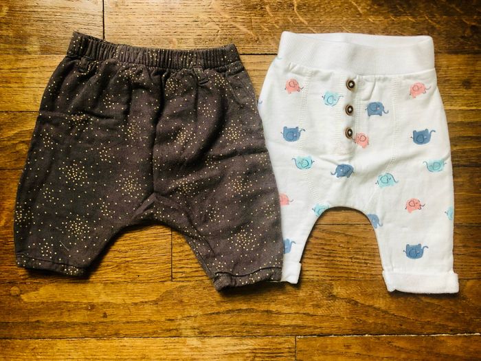 Lot de deux pantalons type sarouels Taille 1 mois: - un pantalon confortable gris-taupe marque Kiabi - un pantalon blanc avec des éléphants colorés marque Gémo Très bon état
