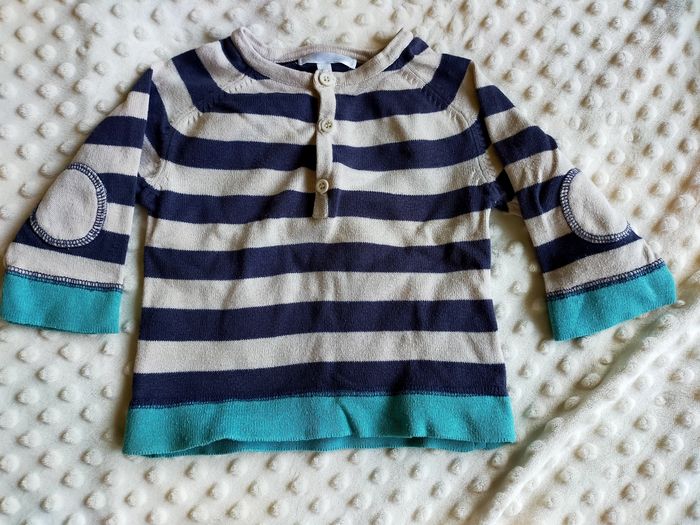 Vends pull à rayures crème, bleu marine et bleu ciel. En très bon état. Taille : 9 mois