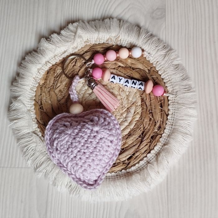Porte clé coeur fait main Différents coloris possibles Vous pouvez ajouter d'autre prénom 10€ pour 1 ligne ( prénom ou perles ) 1€ par ligne supplémentaire