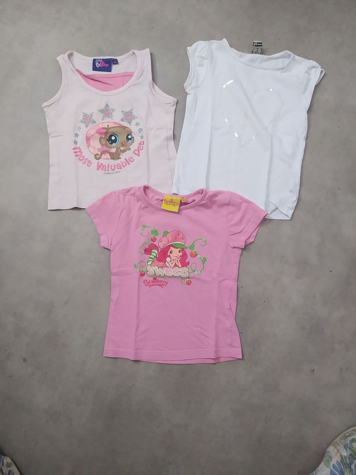3 hauts manches courtes en très bon état 1 tape à l'oeil 1 littlest Petshop 1 Strawberry Shortcake