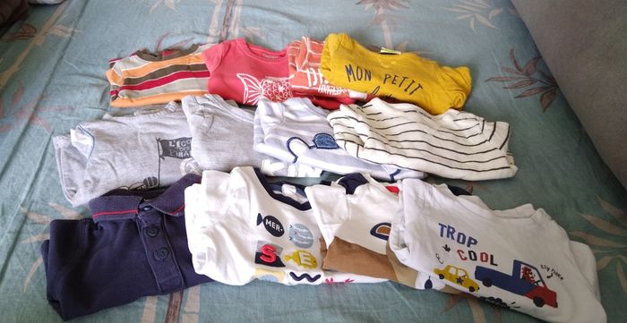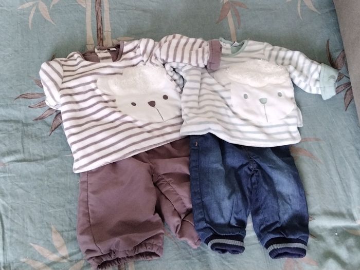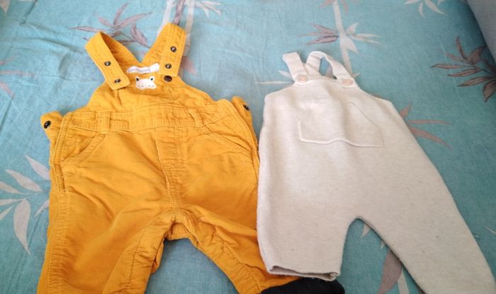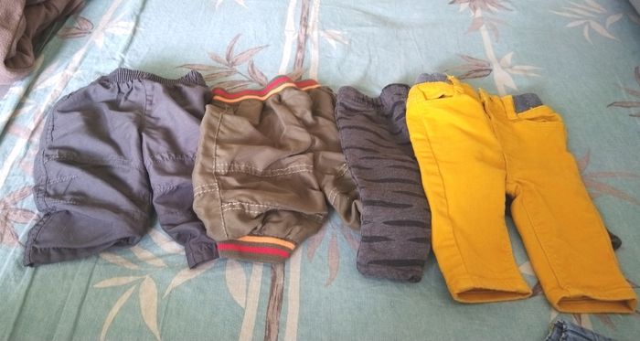Lot vêtements garçon en 3 mois, mi saison et hiver. -6 pantalons -5 jeans -11 bodies - 2 salopettes (une en laine, une en velours côtelé jaune moutarde et doublée) -12 t-shirts manches longues -2 pulls et un gilet zippé - 5 sweets dont 3 zippés, et un à capuche - 1 jogging - 3 ensembles ouatines Différentes marques 44 pièces