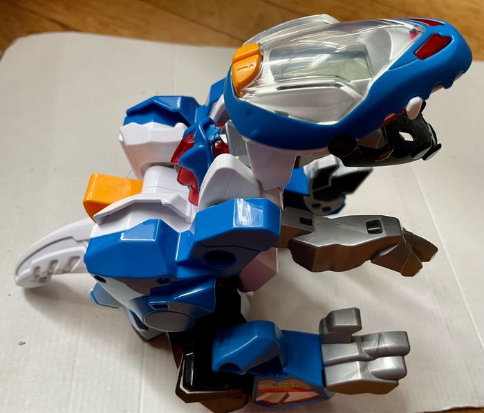 Robot interactif qui se transforme en dinosaure (comme sur la photo ). L’écran LCD a 2 modes : mode robot ou mode dinosaure. Les boutons déclenchent des phrases et des effets sonores. Le gros bouton jaune fait bouger les pattes . La LED rouge dans labouche du dino s’éclaire quand il ouvre la bouche pour cracher du feu. Plus de 60 phrases et effets sonores et lumineux. Fonctionne avec 2 piles LR 03 (je les ai mises ) TBE