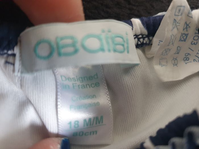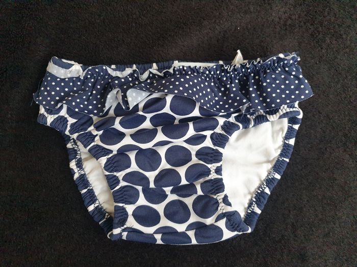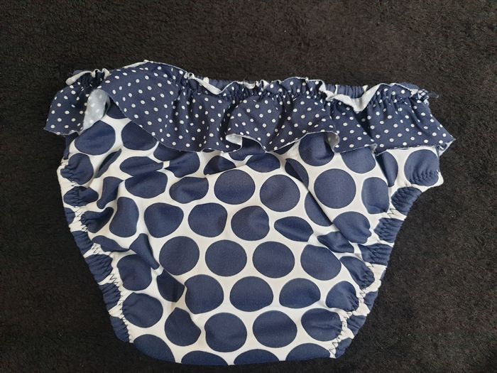 Culotte maillot de bain blanc avec des rond bleu marine. Petit volant. Marque Obaibi. Taille 18 mois.