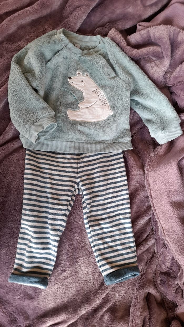 Ensemble polaire pantalon et pull, bien chaud, avec dessin ours blanc . Fermeture par pressions au torse