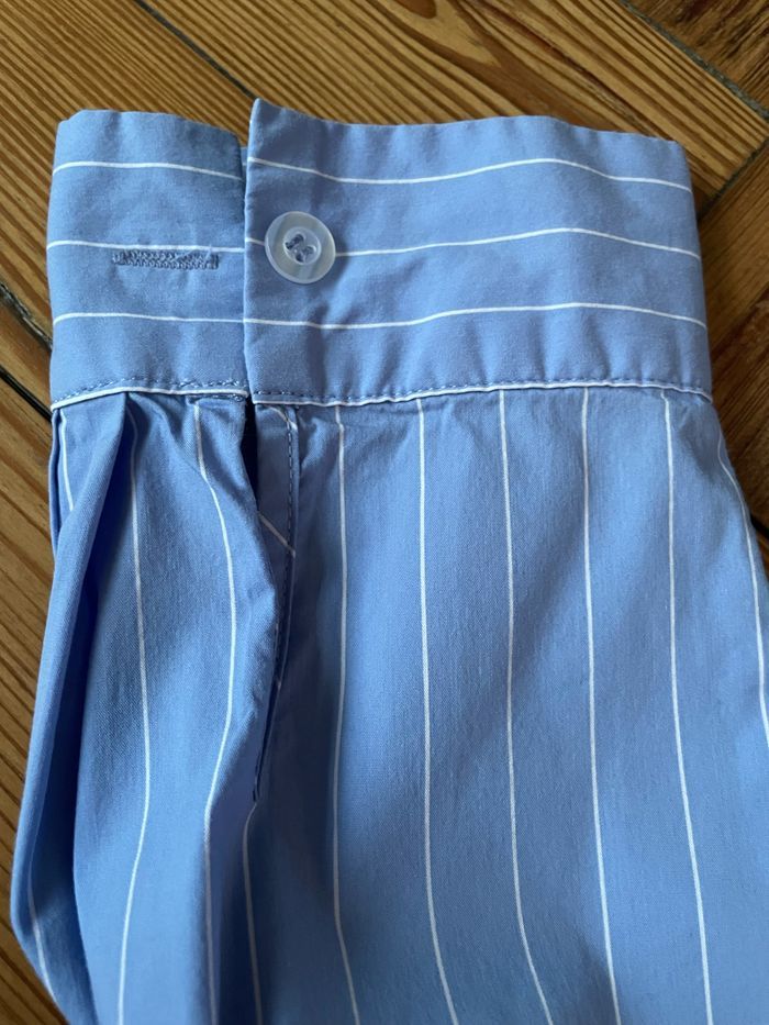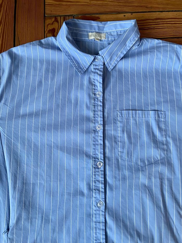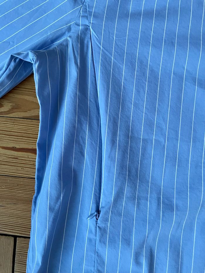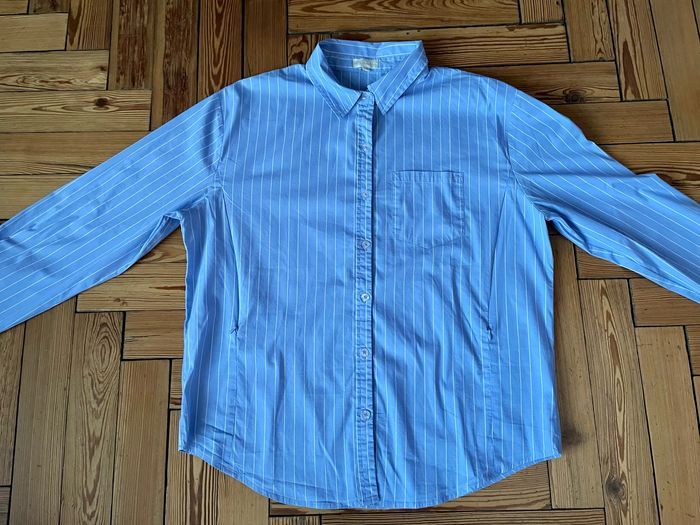 Chemise Sacha Couleur bleue lignes blanches Manches longues Fermeture boutons Double ouverture zip (de bas en haut) Très confort (65%coton/nylon/spandex) Taille L (taille grand) Marque Léa et rose