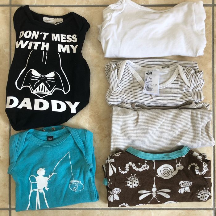 Lot de 6 bodies manches longues Taille 62 cm Ouverture croisée : - body blanc H&M - body rayé beige/blanc H&M - matron motif insectes Lindex Encolure américaine : - body rayé marron/blanc H&M - body noir H&M - body turquoise sans marque
