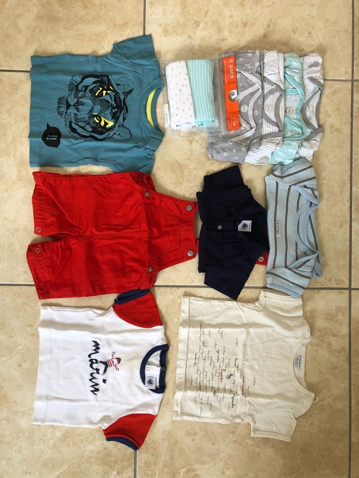 Lot été 67-68 cm - 6 bodies manches courtes encolure américaine dont deux encore neufs dans l’emballage - 1 body manches courtes rayé bleu/marron Calvin Klein - 1 body bleu marine manches courtes col polo Petit Bateau - 1 tenue salopette + tee-shirt marin Petit Bateau - 1 tee-shirt bleu illustré Åhléns - 1 tee-shirt beige avec écritures P’tit Bisou