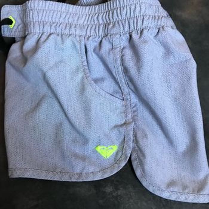 Superbe short ROXY en parfait état Tissus léger 95% polyester 5% élasthanne Gris perle ‘et jaune fluo taille XS