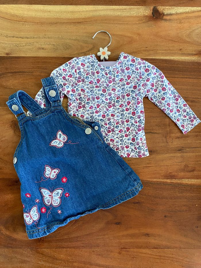 Robe en jean motif papillons 🦋 Tee shirt manches longues motifs fleurs colorées. Taille 6M