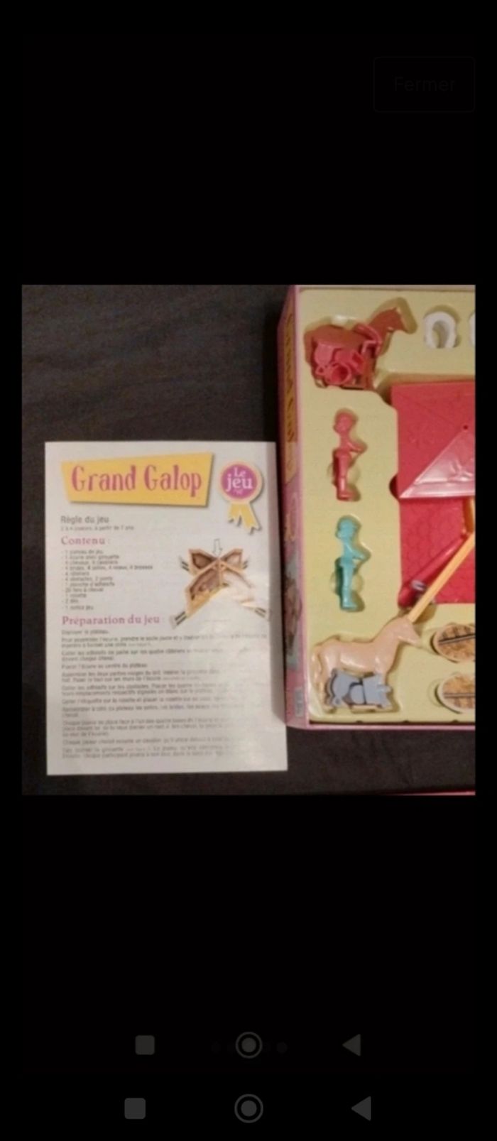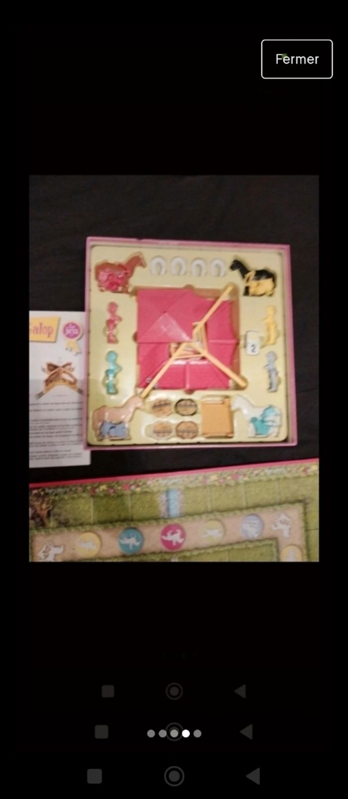 Excellent état Complet avec notice Boîte en très bon état. Age minimum: 7 ans Dimensions: 27 x 6 x 27 cm Nécessite des piles: Non Descriptif produit: En selle avec les héroïnes de la série TV, Steph, Carole et Lisa pour une course Palpitante !Un jeu pour vivre toutes les étapes de la relation avec un cheval : en faisant d’abord tourner la girouette, gagne les quatre accessoires pour préparer ta monture (selle, bride, seau et brosse),puis place à l’entraînement au manège pour maîtriser les cinq allures de ton cheval, et enfin la course finale sur un parcours de cross semé d’obstacles pour remporter la rosette et être sacrée meilleure cavalière ! Contenu du packaging: 1 plateau de jeu, 1 écurie avec girouette, 4 chevaux, 4 cavaliers, 4 brides, 4 selles, 4 seaux, 4 brosses, 4 râteliers, 4 obstacles, 1 planche d’adhésifs, 2 ponts, 20 fers à cheval, 1 rosette, 2 dés, 1 notice. Nombre de joueurs: 4 Durée d'une partie 30 minutes environ.
