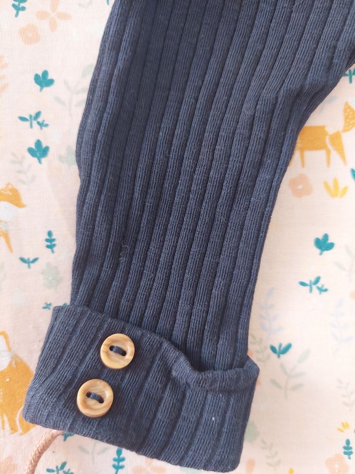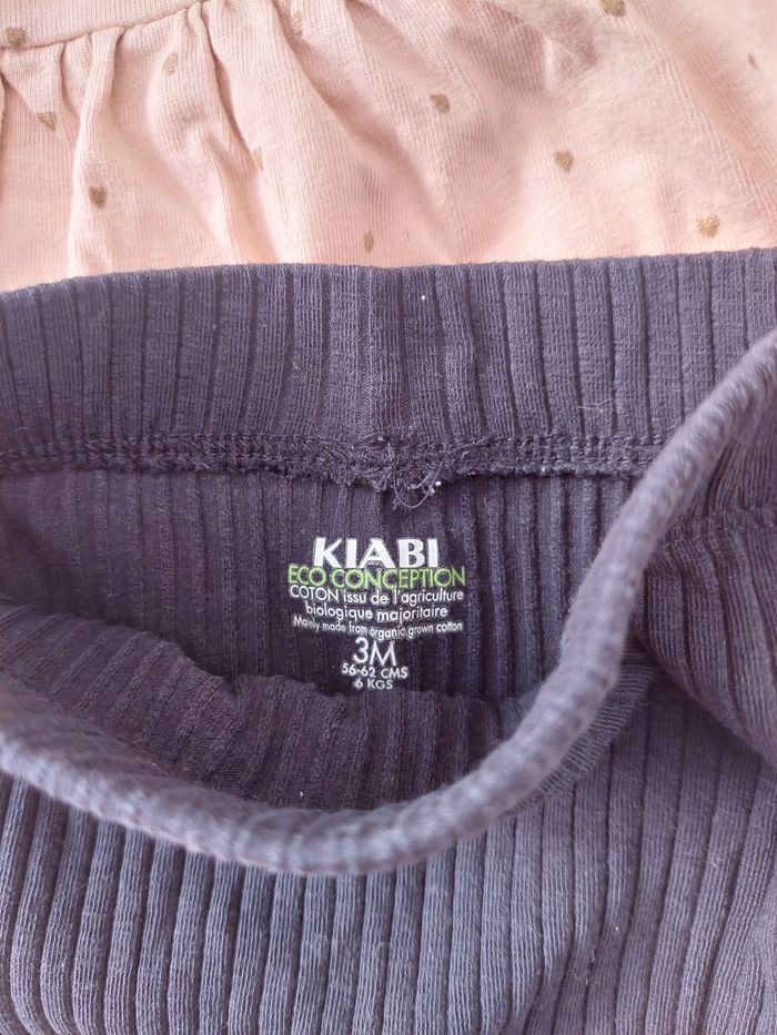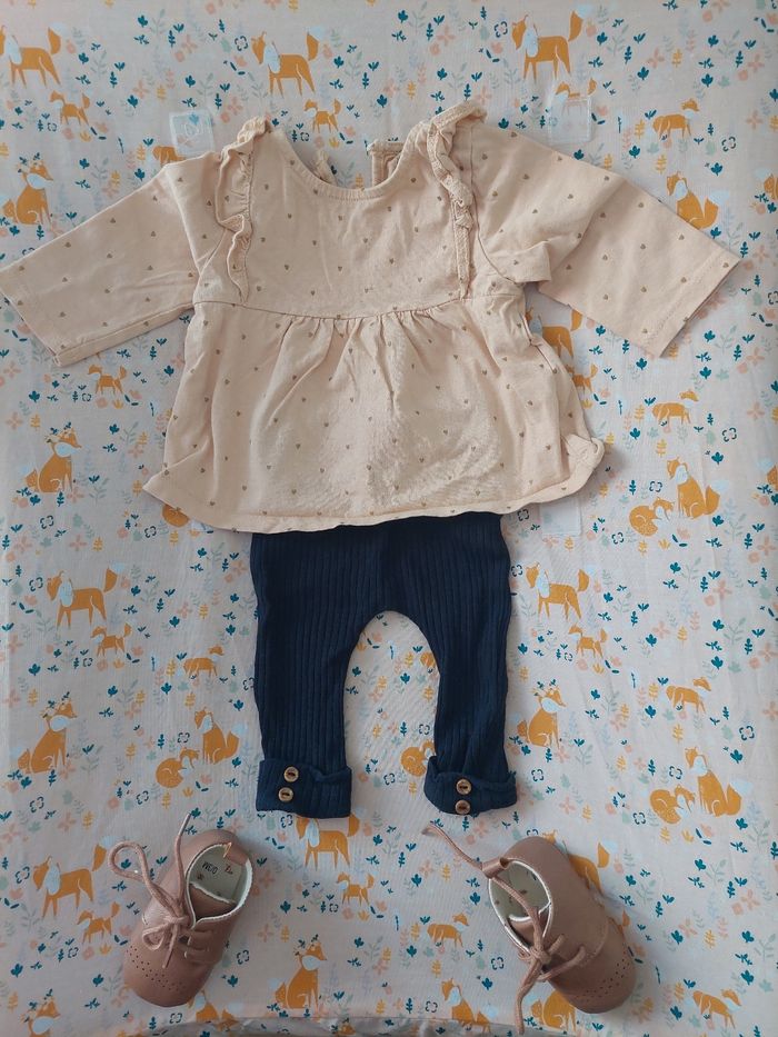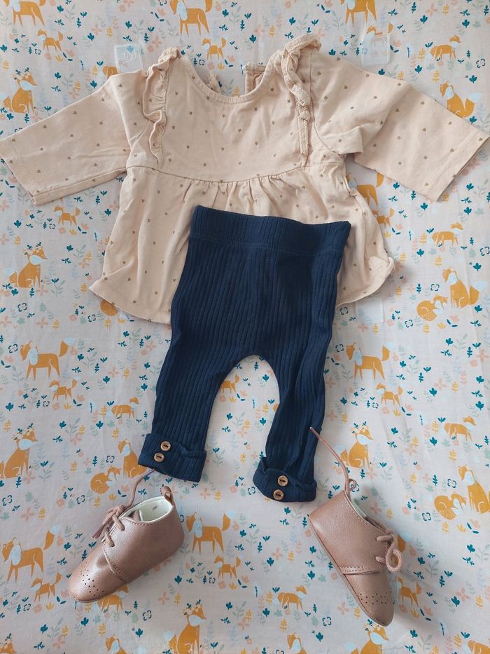 Ensemble 2 pièces de chez kiabi, une blouse avec un legging. En très bon état Taille: 3 mois Le haut est beige et le bas bleu marine. Chaussure vendu séparément
