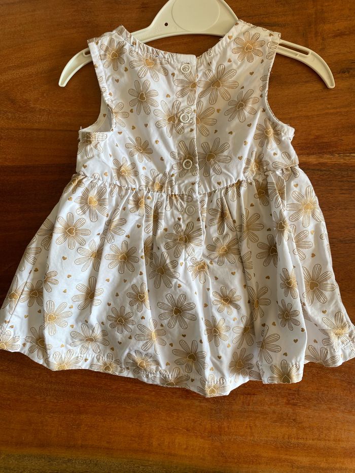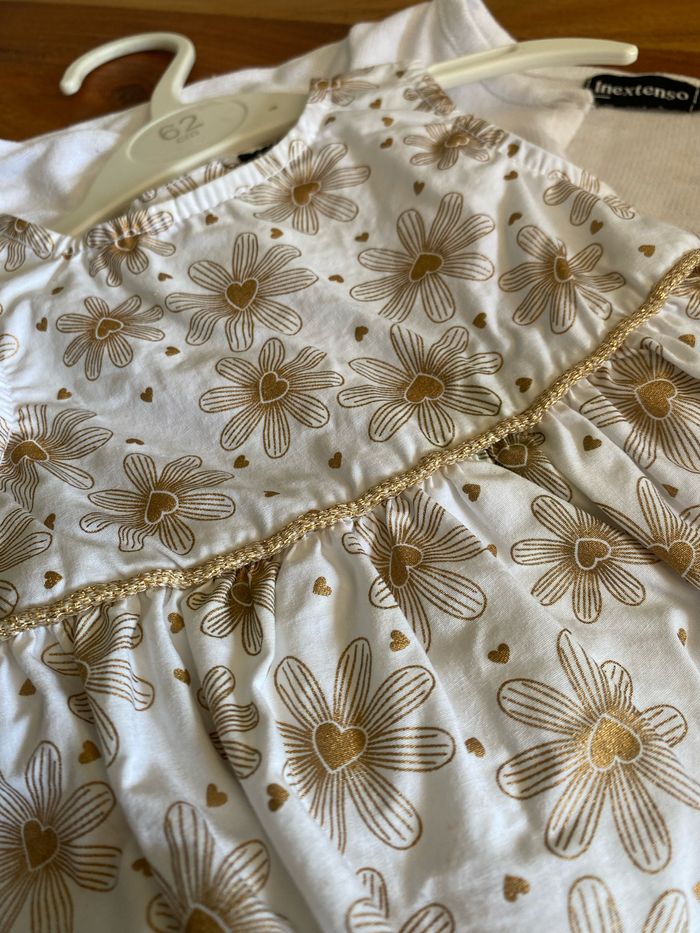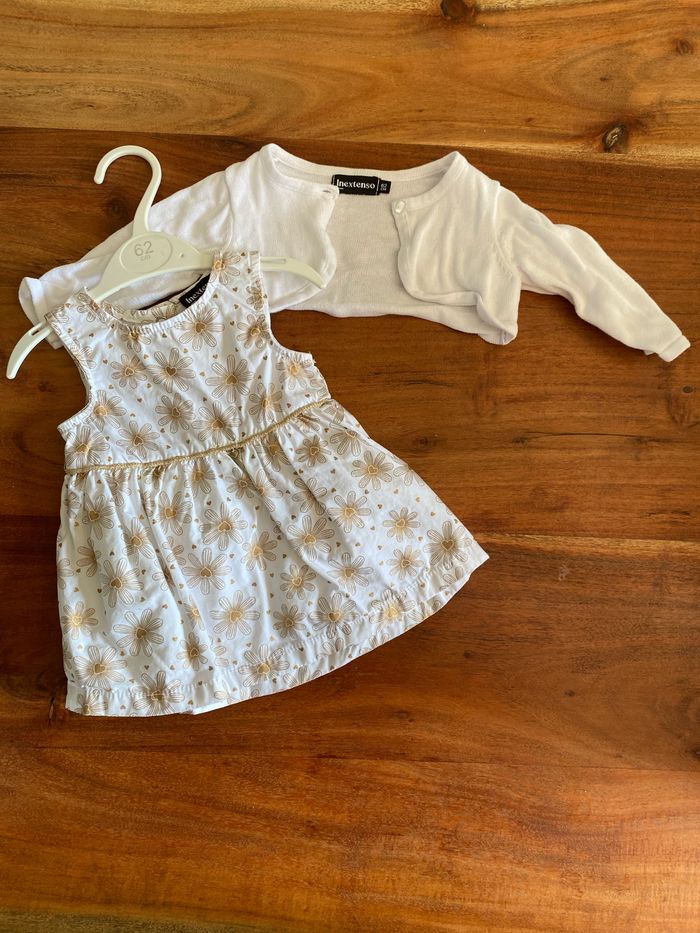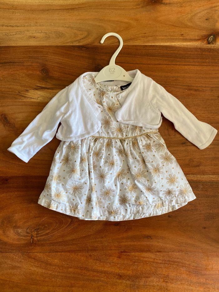 - Robe manches courtes blanche motifs fleurs cœurs dorés - Gilet court blanc manches longues Ensemble porté 1x Taille 3M Inextenso