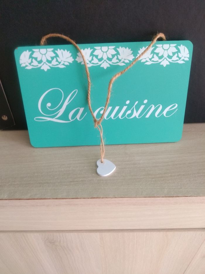 Plaque de décoration "La cuisine". Neuf. Petit défaut sur le coin supérieur gauche (voir photo). Dimensions : 21 x 13 cm.