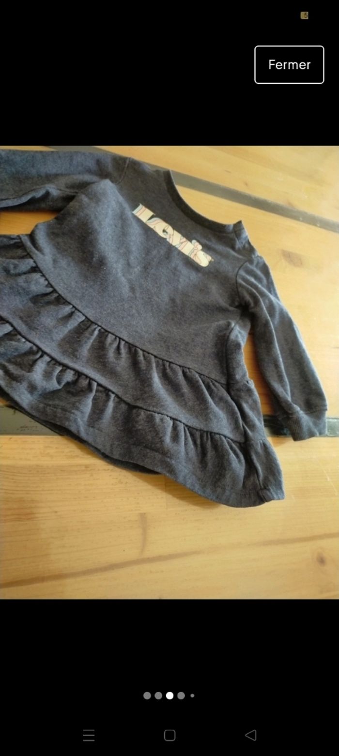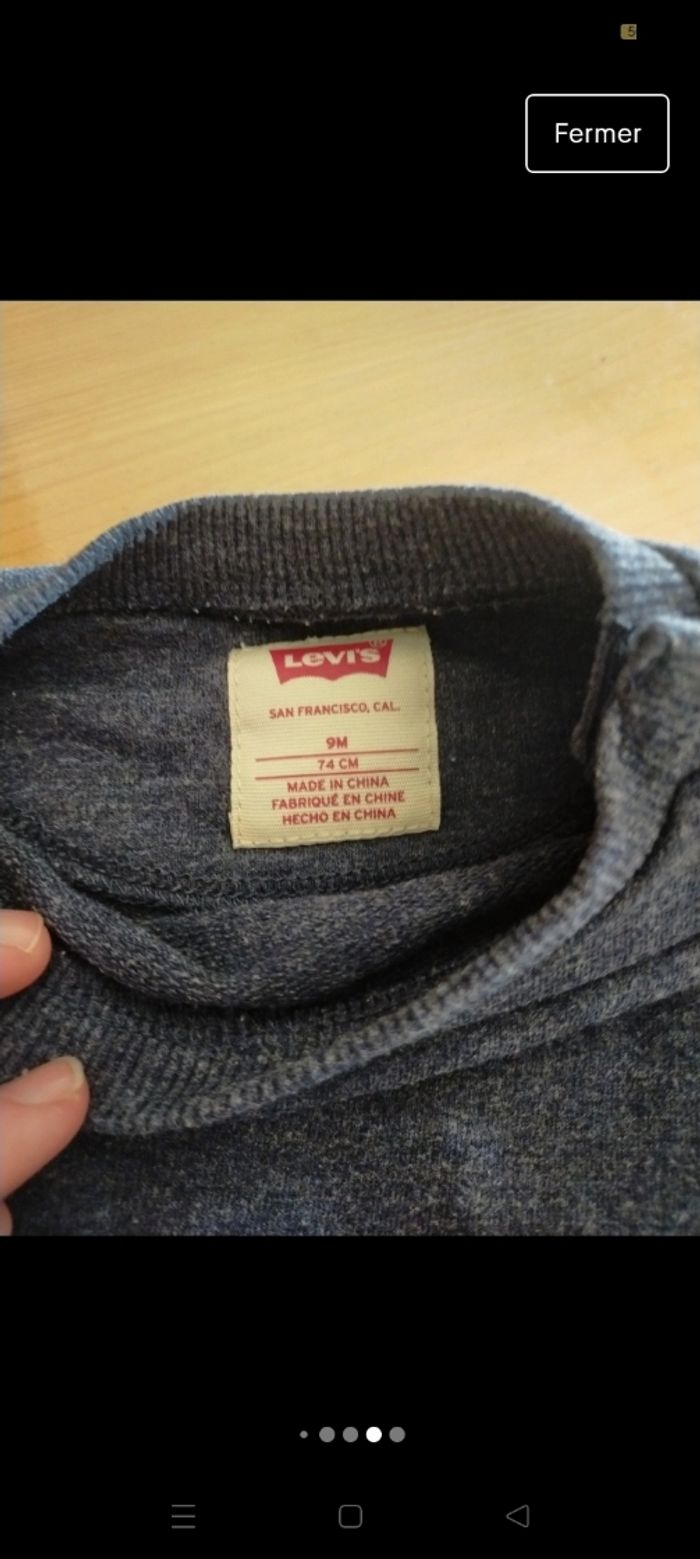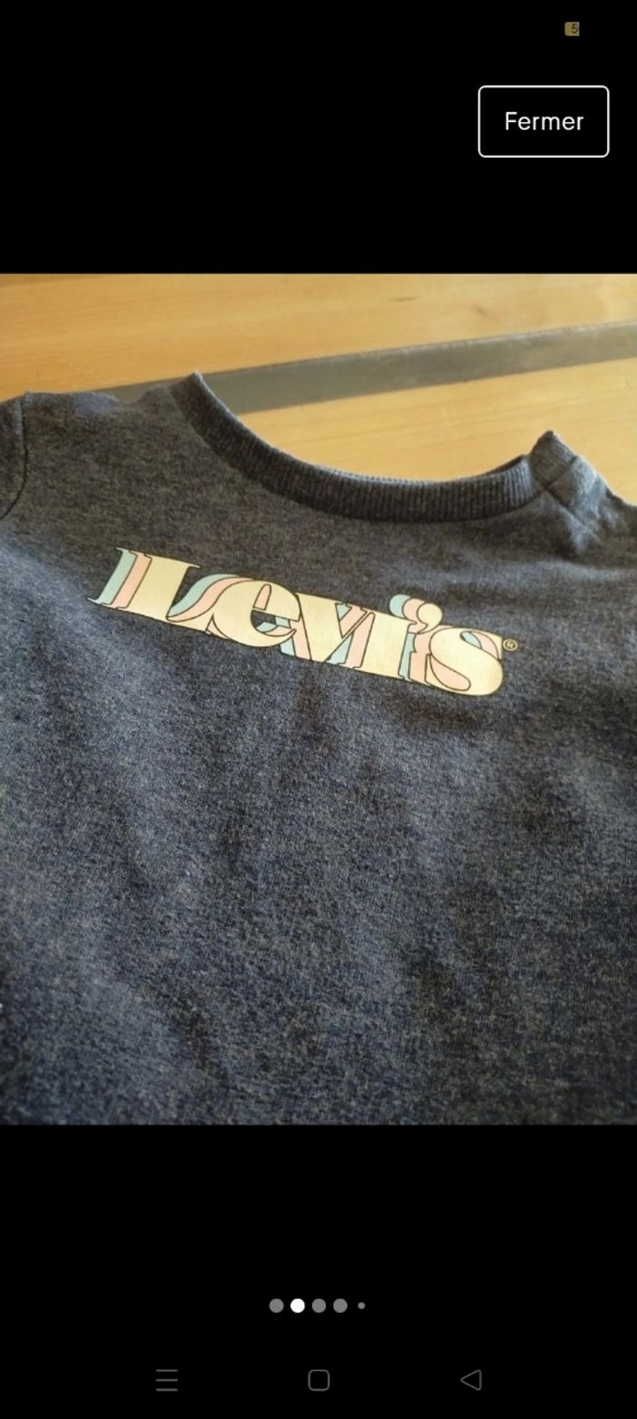 74cm. Bleu. Inscription "Levi's" beige, rose et bleue ciel. Volantée sur le bas. Fermeture par 2 pressions en plastique à l'épaule gauche.