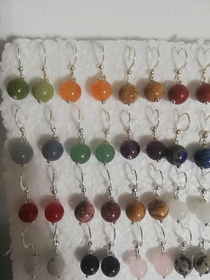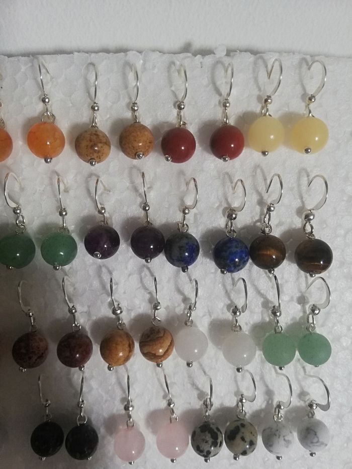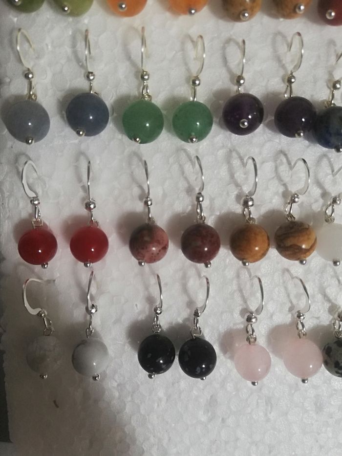 Lot de 20 paires de boucles d'oreilles en pierre naturelle et métal argenté sans Nikel. 38euros le lot. Envoie possible par mondial relay ou chronoshop2shop ou relais colis Provenance des pierres Serpentine France Cornaline Madagascar Améthyste Brésil Quartz rose Brésil Oeil du tigre Afrique Lapis lazuli Brésil Howlite mat et howlite brillant Brésil Jaspe dalmatien Mexique Aventurine bleu Brésil Aventurine mat et aventurine brillant Brésil Calcite jaune Mexique Jade blanc Guatemala Jaspe bois Inde Jaspe léopard Inde Jaspe paysage Madagascar Jade rouge Madagascar