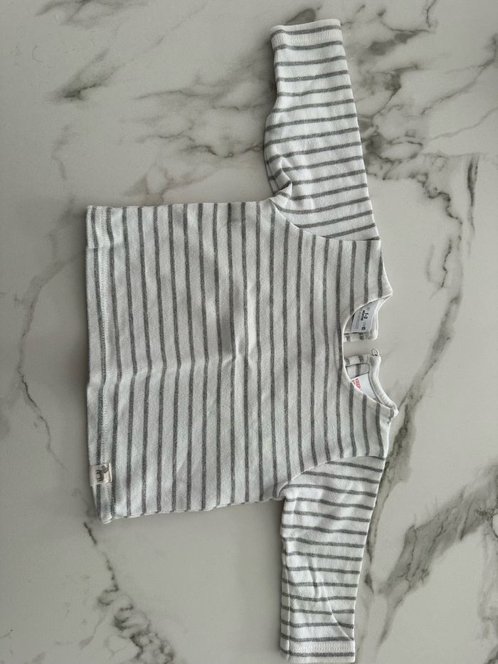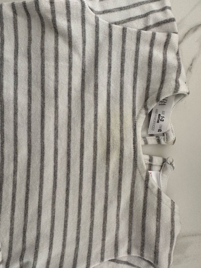 Rayé blanc et gris Pour jumeau Haut du pull un peu jaunis sur l’un des deux à cause du fer (médicament) cf la photo jointe Sinon peu porté Taille 1 à 3 mois mais correspond davantage à du 3 mois