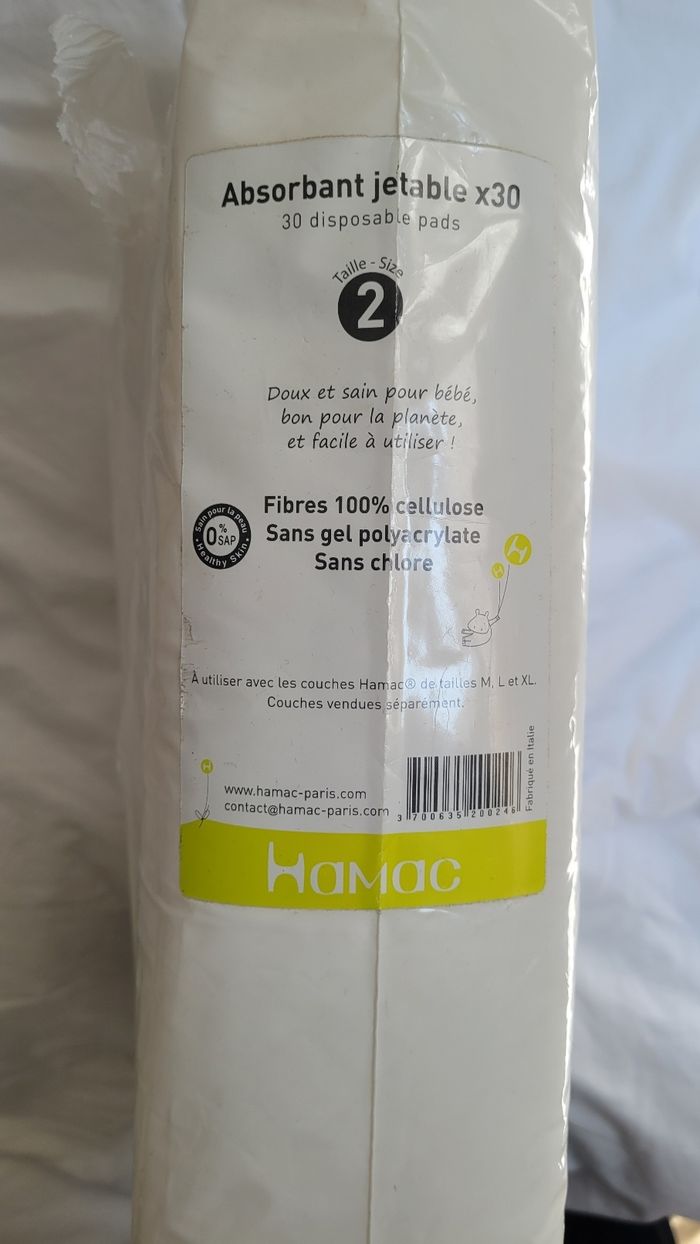 Lot de couches lavables T2 Hamac qui comprend: 4 couches classiques utilisées mais bon état 4 couches T Mac (2 quasi neuves + 2 utilisées mais en bon etat) 2 nacelles pour couches TMac 1 couche de bain avec son insert 6 absorbants spéciale nuit 16 absorbants (12 microfibre + 4 coton) 12 renforts d'absorption en microfibre 28 absorbants jetables