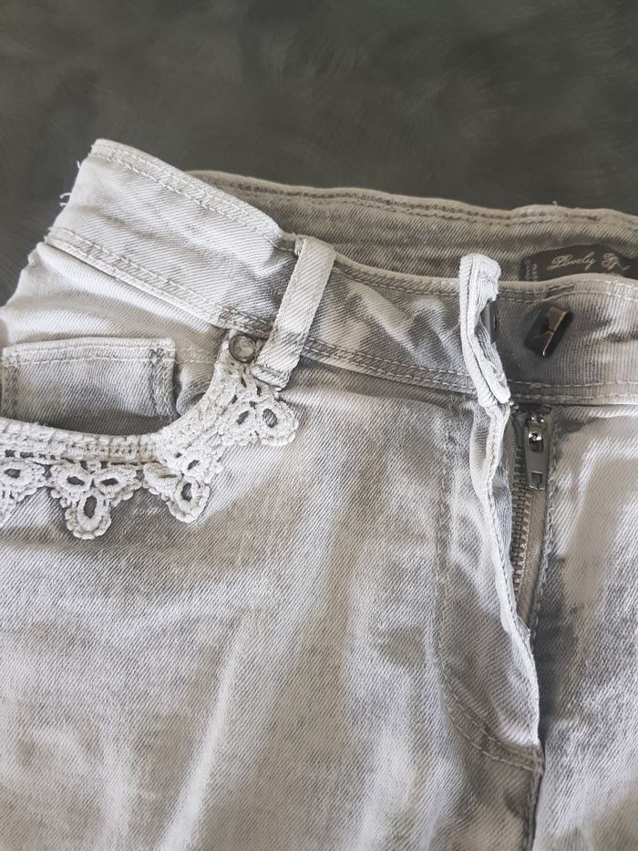 Short gris léger. Avec poches latérales et ses strass et poches arrières. Ceinture réglage. Fermeture éclair et crochet.