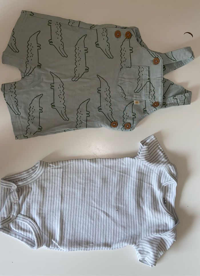 Salopette, avec son body en 12 mois, petits trous sur le body mais acheté comme ça !