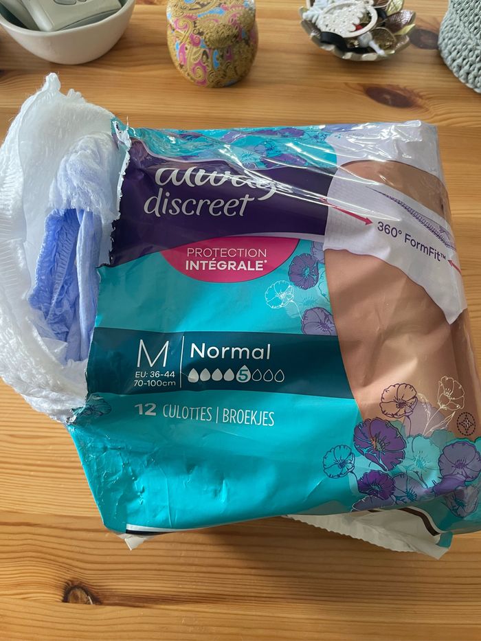 Paquet ouvert, 9 couches sur 12. Très pratique pour le post partum.
