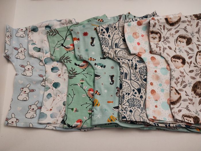 Lot de 7 t-shirts cousus par mes soins, peu ou pas portés. Fermeture pression dos Taille 3 mois Motifs: Lapins fond bleu Eucalyptus Rouge gorge Océan Forêt bleue Bulles multicolores Hérissons