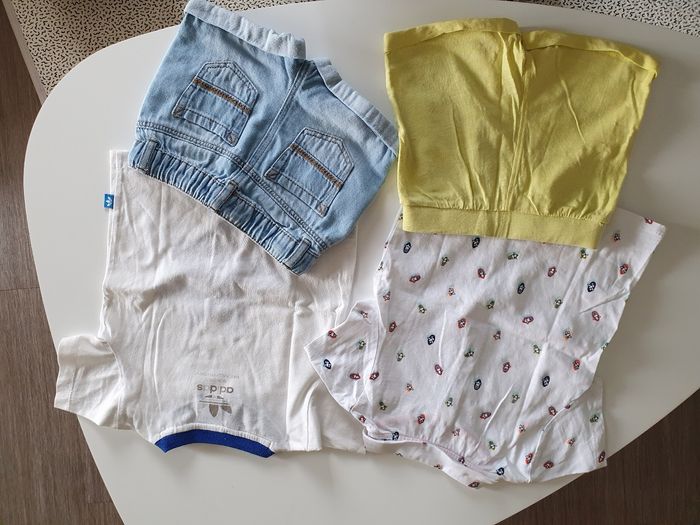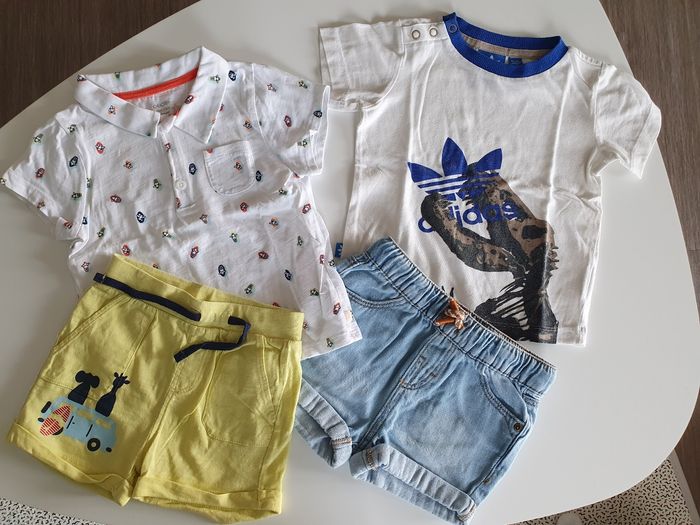 Ce lot contient : 1 short jaune en coton okaidi 1 polo blanc à motif en coton okaidi 1 Tee-shirt adidas original tyrannosaure 1 short en jean clair