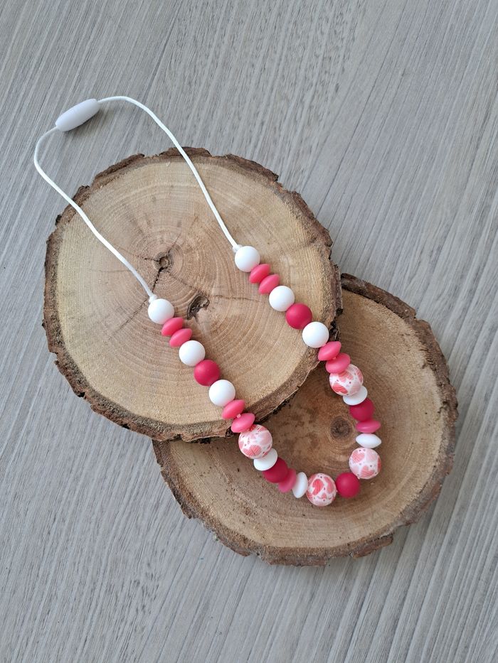 Collier d'allaitement et portage,confectionné avec des perles silicones alimentaires respectant les normes de sécurité. Perles dans les tons de roses, blancs et certaines avec des motifs Cœurs. Longueur 57 cm.