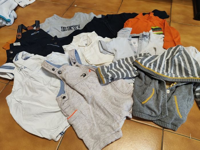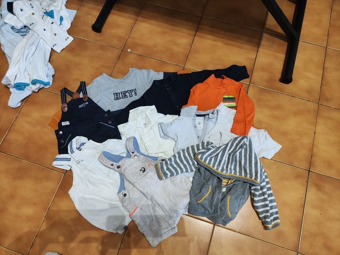 Ce lot compose de 3 t-shirt à manches longues, 2 vestes manches longues, 3 body manches courtes et 3 salopettes en bon état pour 12 mois