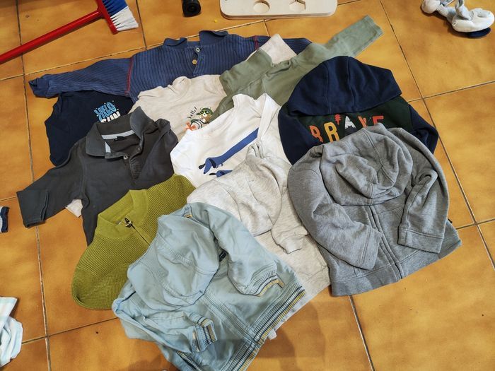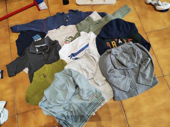Dans ce lot il y a 3 vestes à manches longues dont 2 avec capuche, 7 t-shirts à manches longues et un body manches longues en bon état.