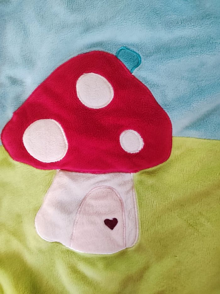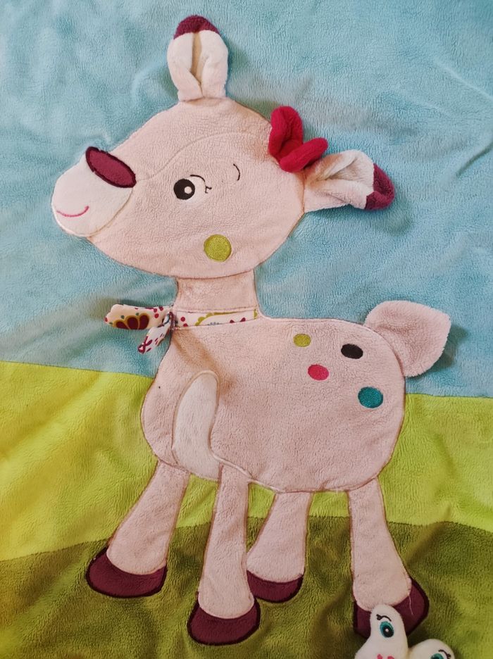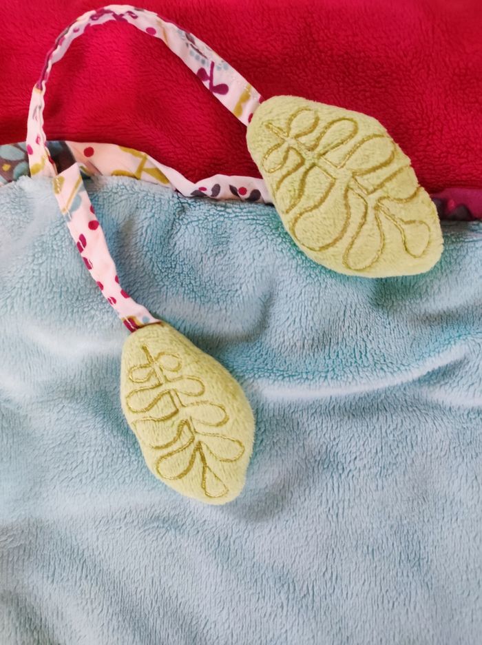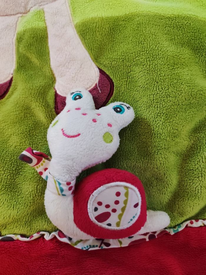 Tapis d'éveil carrée en très bon état avec un petit escargot qui fait du bruit quand on le pince et un petit hochet en forme de feuille (faire défiler les photos)