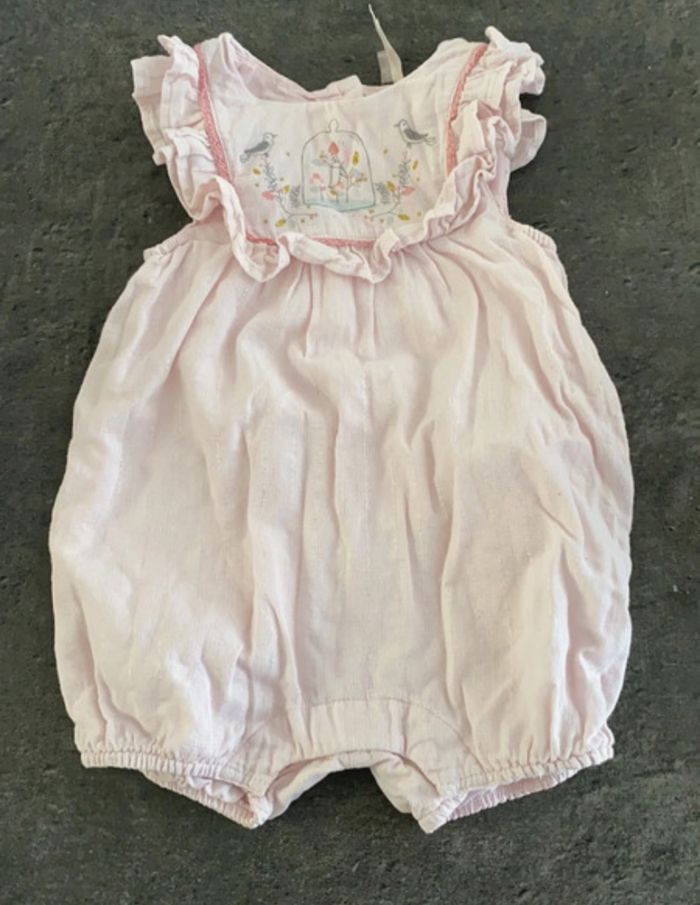 Rose pâle avec liserés argentés, décor cage à oiseaux sur le haut. Pression à l’entrejambe