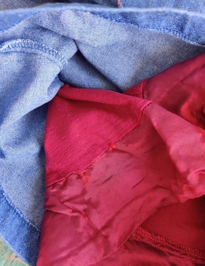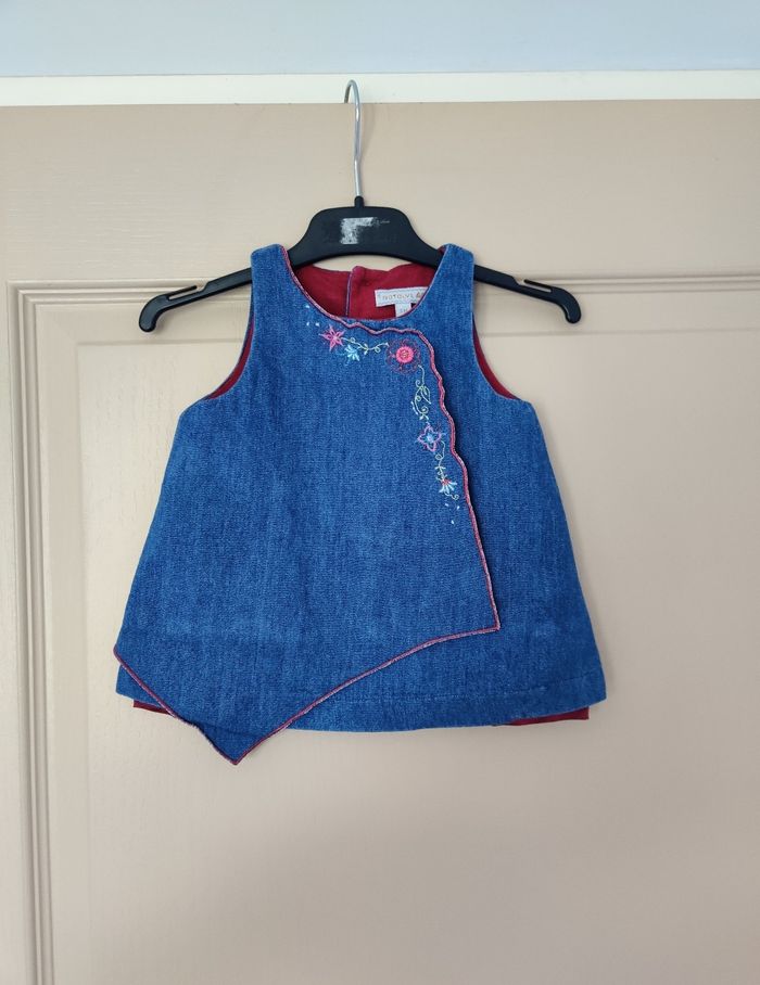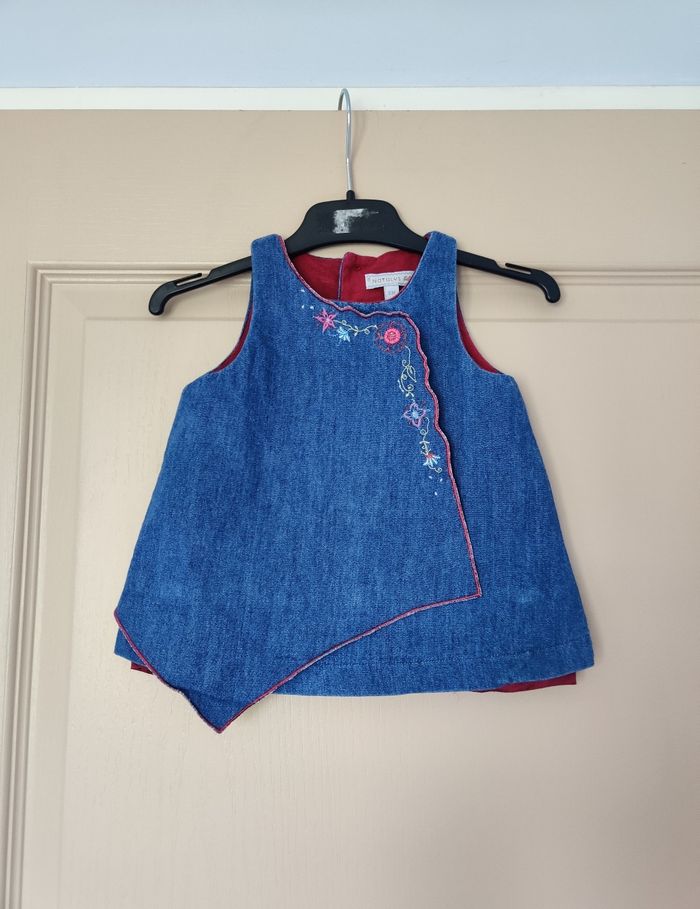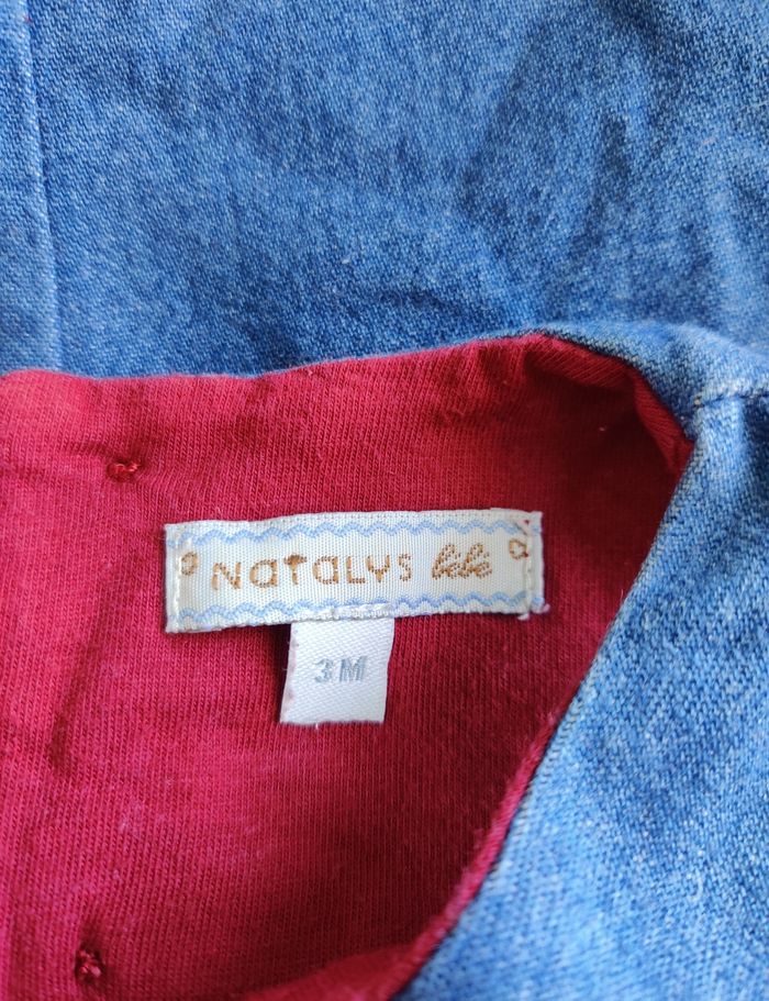 Jolie robe en jean natalys Encore en très bon état Taille 4 mois Fermeture boutons au dos Doublure satinée. Un peu frottée sur le bas. Voir dernière photo