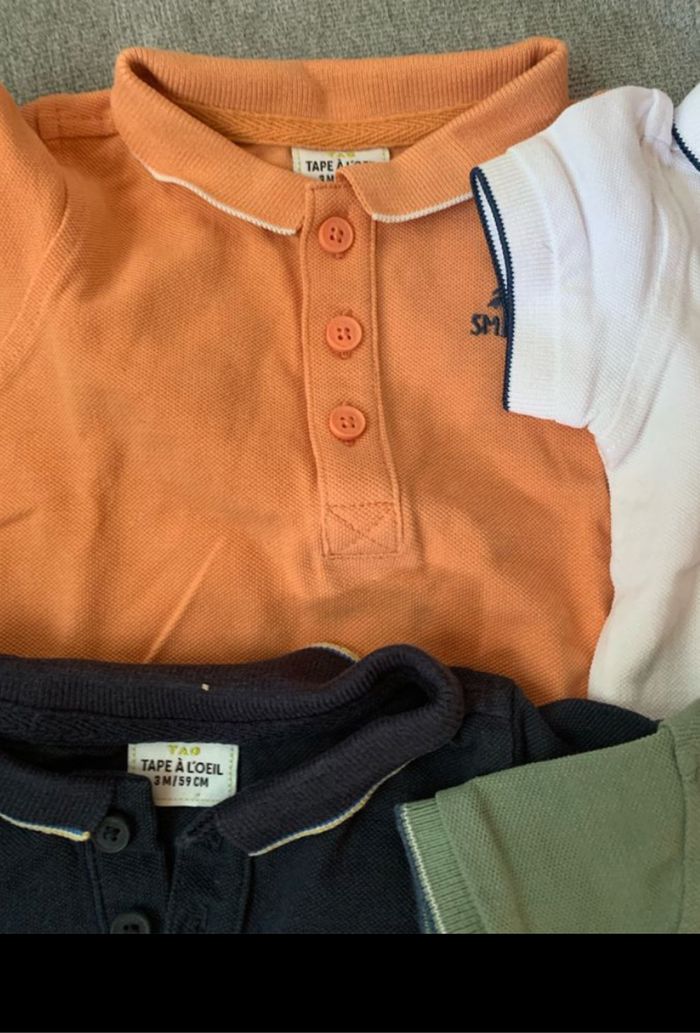 Vends lot de 6 polos En très bon état Taille 3 mois Marque kiabi et okaidi Le dernier a juste une petite tache sur le devant