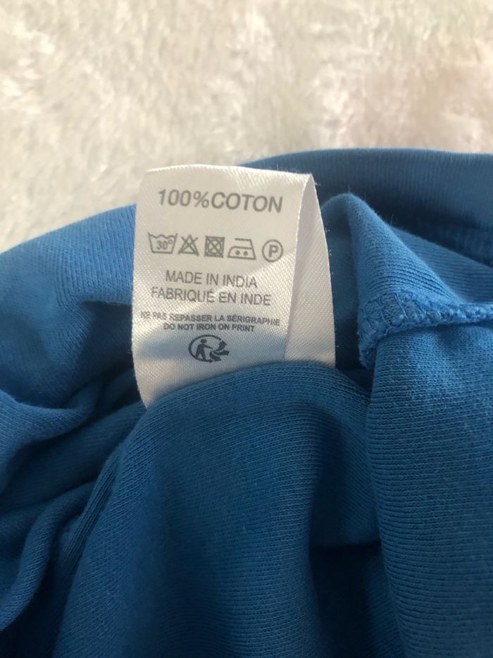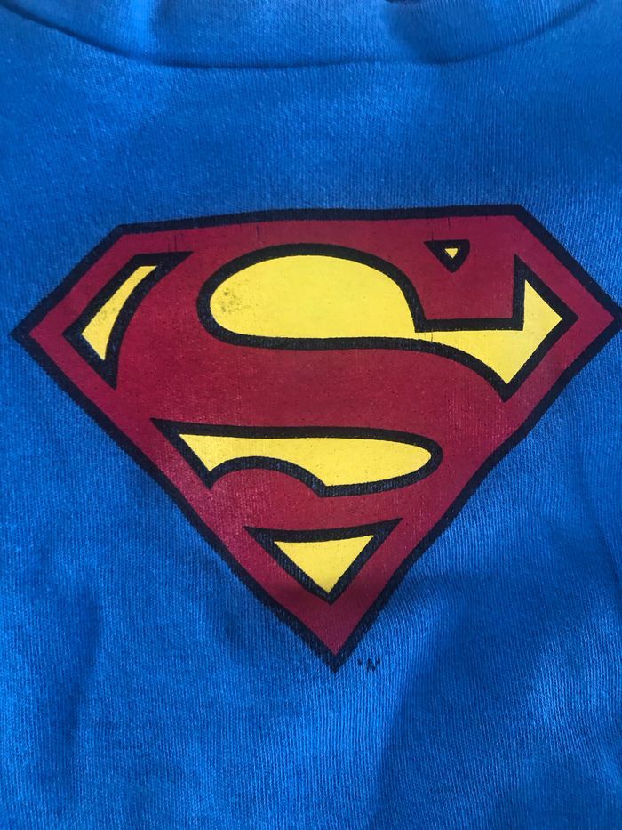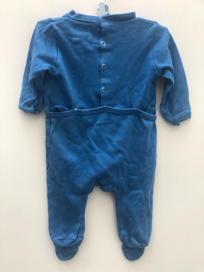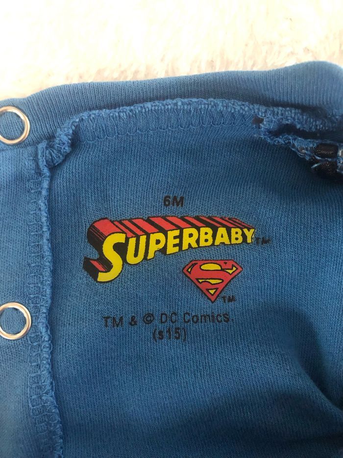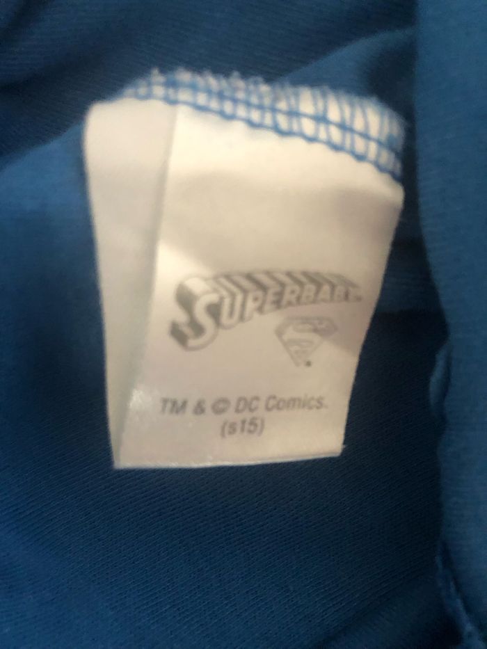Pyjama bleu Superbaby Logo légèrement craquelé (voir photo) Longueur : 49 cm Largeur d’épaules : 21 cm Largeur ceinture : 25 cm Matière : 100% Coton