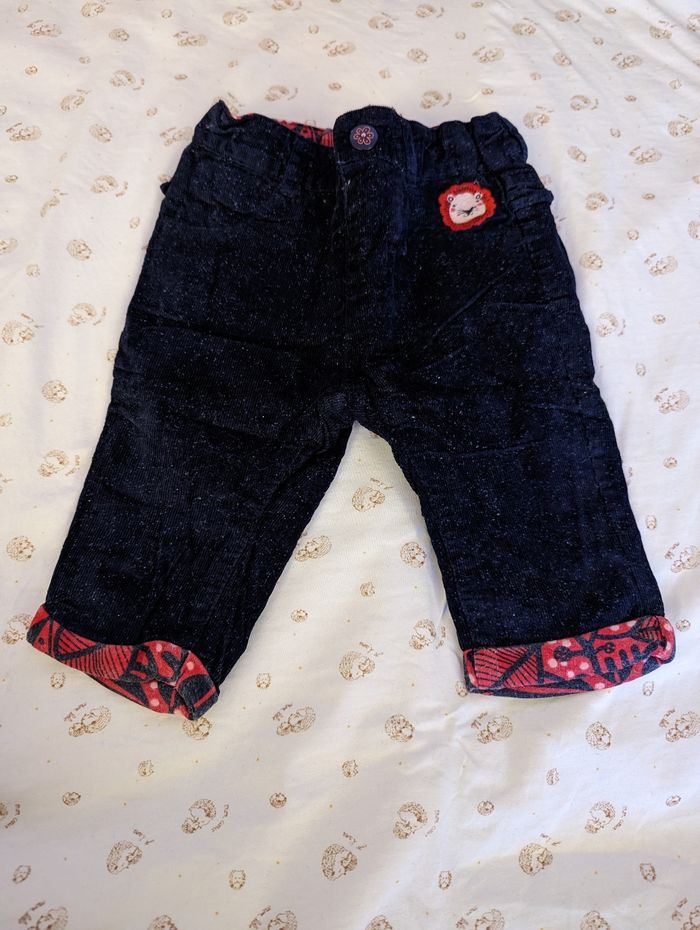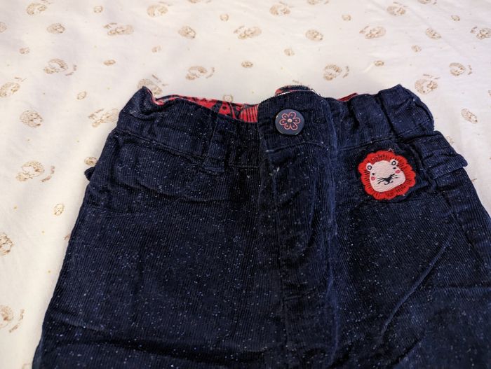 Joli pantalon velours marine foncée DPAM. Broderie lion, froufrou décoratif. Tour de taille réglable avec élastique à boutons à l'intérieur du pantalon. Très bon état. La doublure à l'intérieur a une couleur un peu plus fade que neuf, le rouge est un peu passé. Pour le bleu marine il est encore très sombre, il est en parfait état une fois porté. Du Pareil Au Même 3 mois, 59 cm.