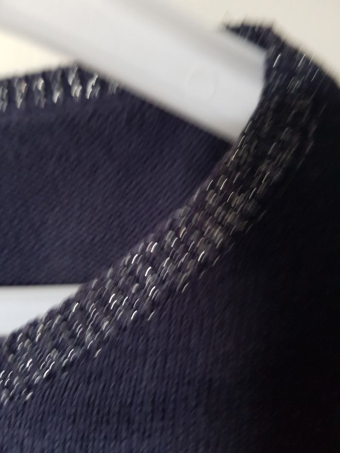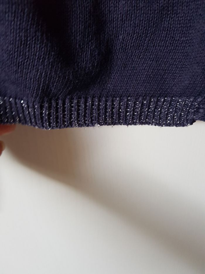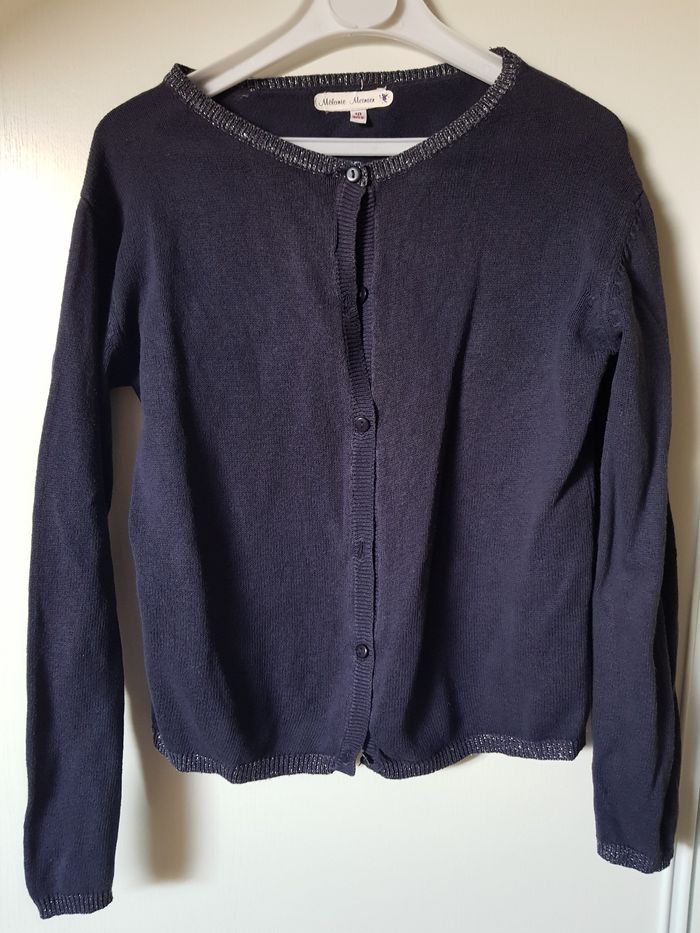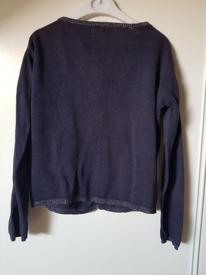 Gilet bleu marine, le col, le bout des manches et le bas du gilet sont pailletés. En très bon état.
