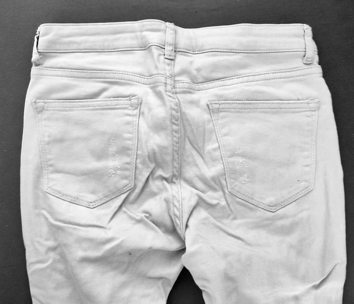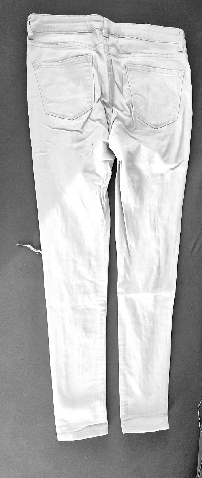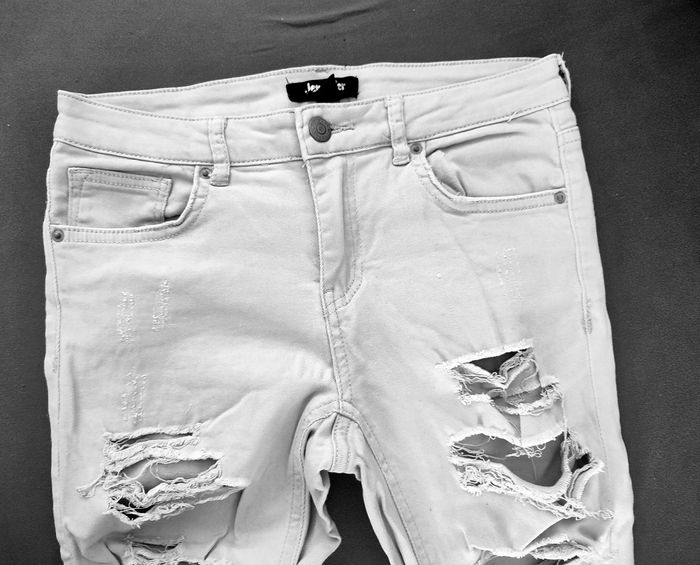 Jeans à trou porté quelques fois, très confortable. Tissus très légèrement élastique. Paraît blanc mais il est en réalité gris clair.