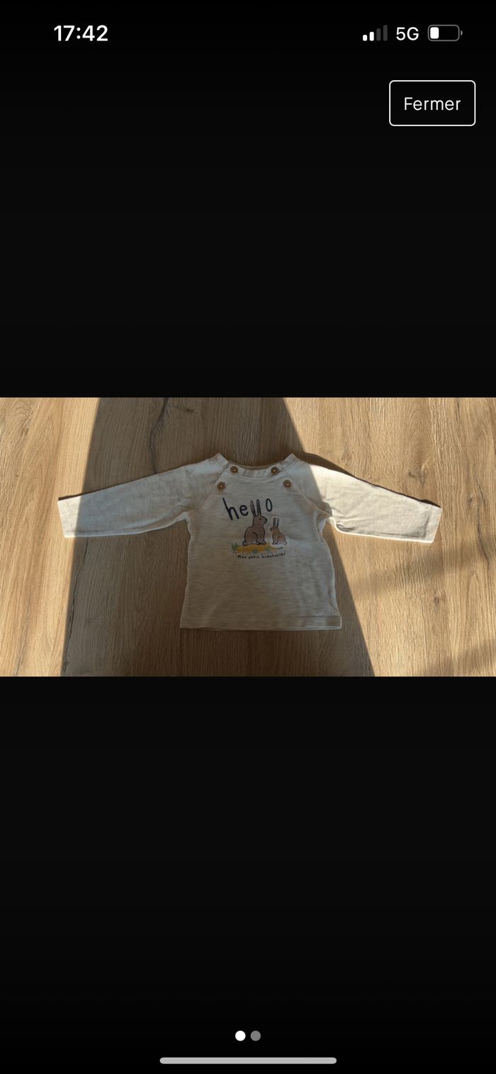 Bonjour Je vends ce t-shirt manches longues taille 3 mois ou 59 cm acheté chez tape à l’œil