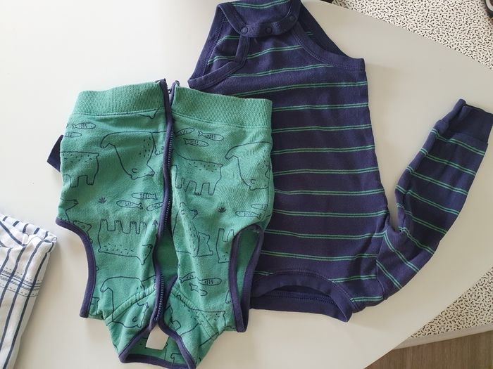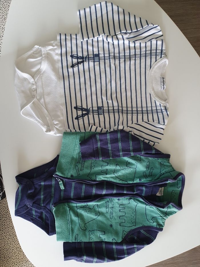 Ce lot contient : 1 body avec Tee-shirt manches longues intégré. 1 body avec gilet zippé, sans manches, assorti. Gilet en coton style molleton léger. Pas de tâches ni troues