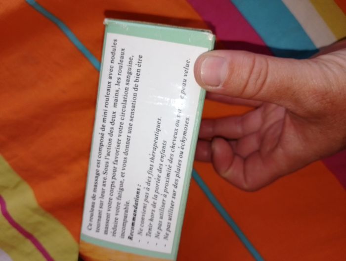 Rouleau de massage neuf Composé de mini rouleaux avec nodules tournant sur leur axe. sous l'action des deux mains, les rouleaux massent votre corps pour favoriser votre circulation sanguine, réduire votre fatigue, et vous donner une sensation de bien être incomparable! RECOMMANDATIONS -ne convient pas a des fins thérapeutiques -ne pas utiliser a proximité des cheveux ou sur une peau velue -ne pas utiliser sur des palies ou echymoses