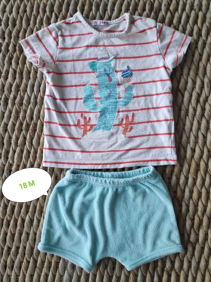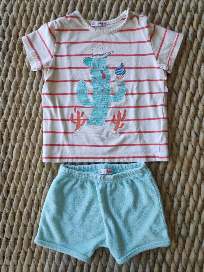 Pyjama avec t-shirt et short (pyjashort) Du Pareil Au Même, 18 mois/80 cm, bien porté mais en bon état. Mixte. T-shirt avec pressions au col. Short en matière éponge.