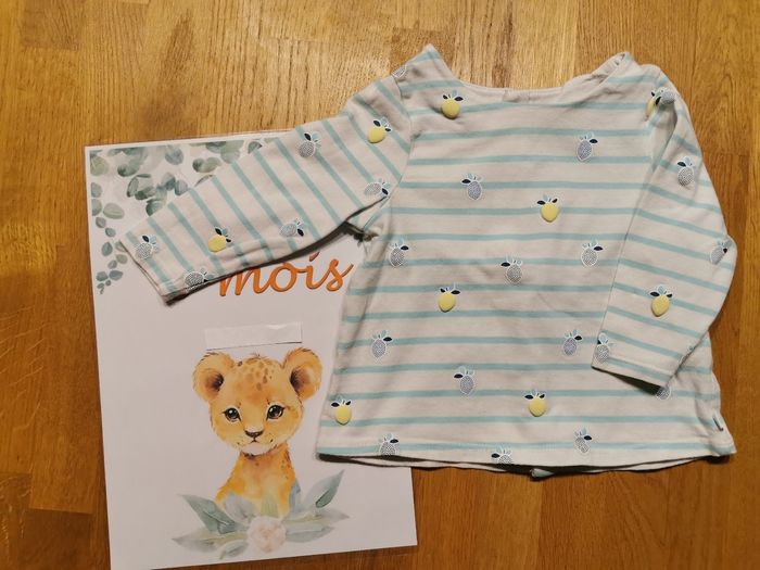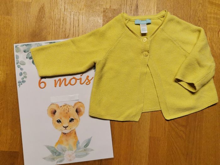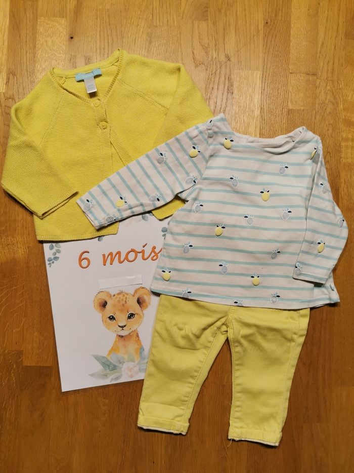6 mois Ensemble 3 pièces, thème acidulé : - 1 gilet jaune, 2 boutons - 1 tee-shirt manches longues blanc, bleu et jaune, avec motifs citron - 1 pantalon jaune avec taille réglable par élastique et boutons #ensemblebebe #ensemblebébéfill #ensemblebebe6mois #ensemblebebe6moisfille #ensemblefille