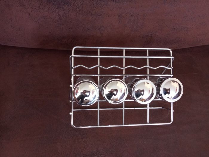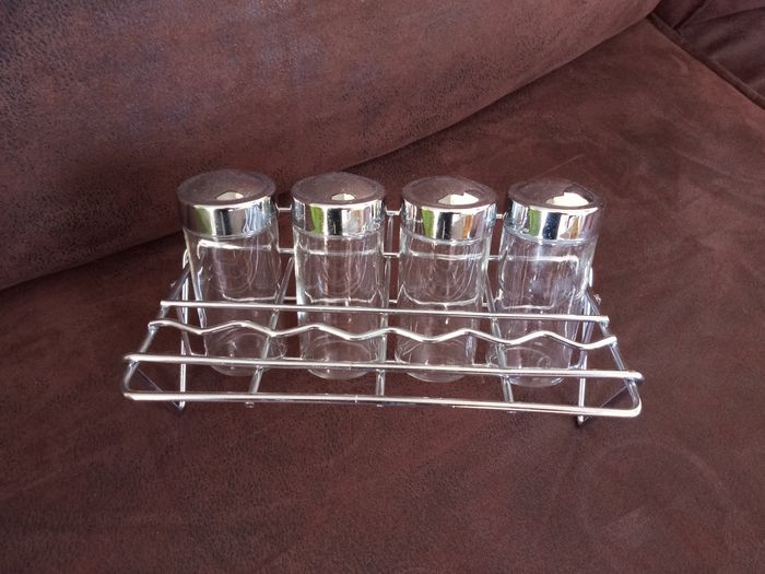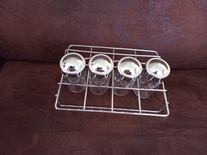 Ensemble de 4 petits pots avec couvercle pour épices sur leur support en métal Pots transparents en verre avec couvercles en plastique de couleur alu Dimensions: Hauteur 8cm - Diamètre 3,7cm Astucieux et pratiques dans leur support pour trouver une place dans la cuisine (vous pouvez en rajouter 4 autres sur le devant) Pots en parfait état, peu servis