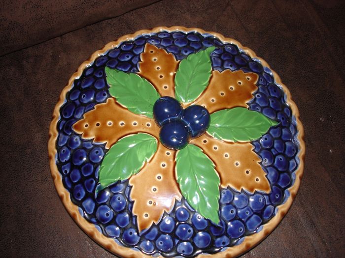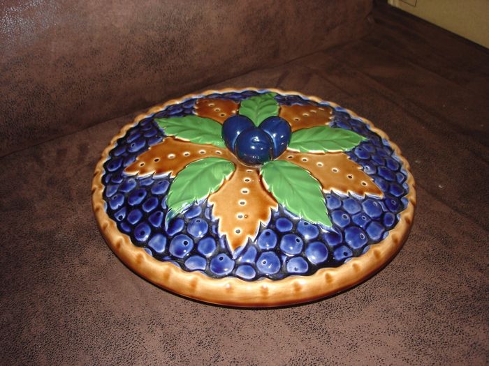 Ravissant Plat avec son couvercle (fabrication japonaise) Forme: Ronde Dimensions: Diamètre 27,5cm - Hauteur 5cm Couleur: Marron, Bleu et Vert avec jolis motifs en relief Matière: Céramique Très joli plat de présentation, élégance sur votre table Plat comme Neuf, très peu servi
