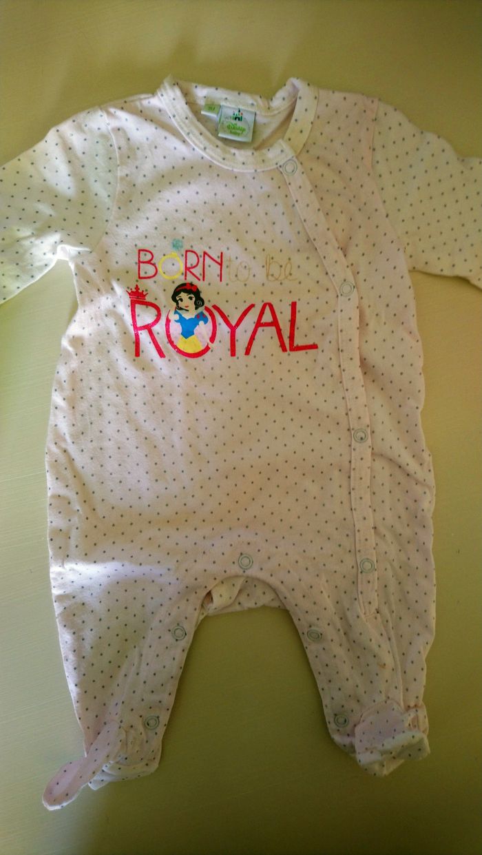 Pyjama fin Disney Blanche Neige, blanc rosé avec petits points gris argenté, " Born To Bef Royal", 3 mois