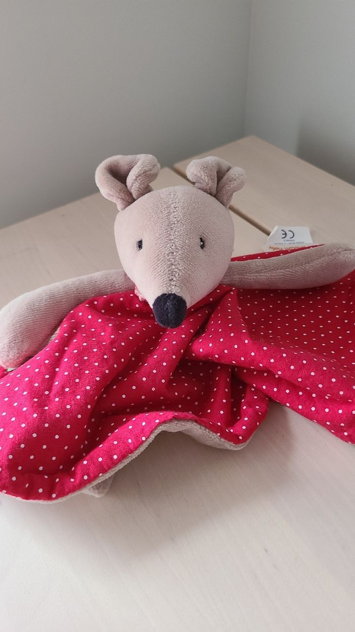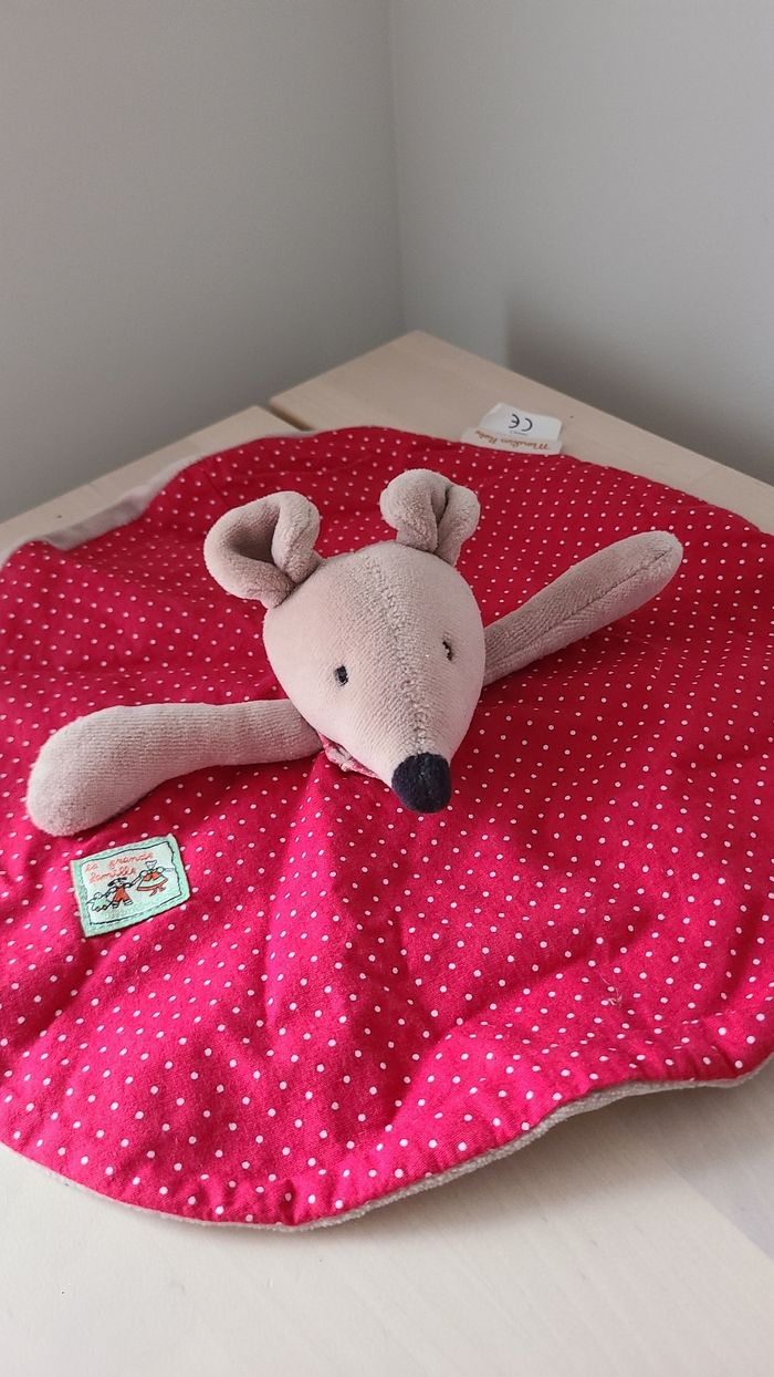 Moulin Roty Doudou plat rond souris rose grise robe rouge pois La grande famille