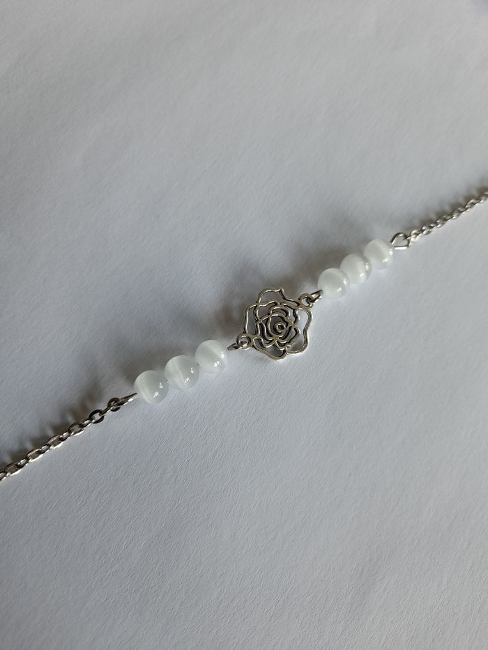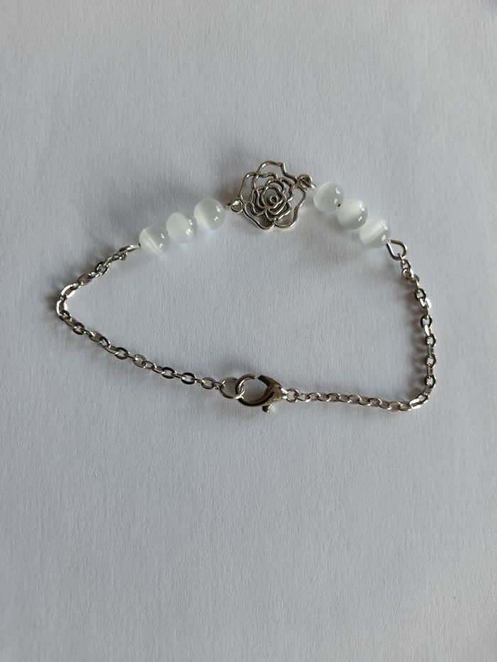 Bracelet argenté orné de pierre de lune et d'une fleur. Fait main ✋ par mes soins 15€ le bracelet N'hésitez pas à me contacter pour toutes demandes complémentaires ;) Idée cadeau de fin d'année :)