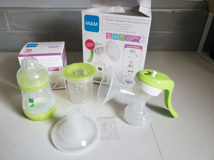 Tire-lait manuel avec kit d'allaitement et une boite de coussinets d'allaitement neuve. Le tire-lait est complet avec valve de rechange et tétine de biberon neuves, jamais utilisée. Le tire-lait n'a servit qu'une fois. A venir chercher sur place.