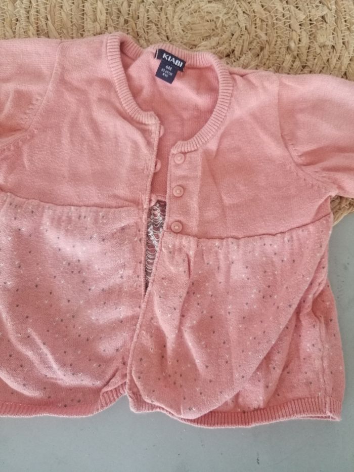 Bonjour, Je vends un gilet ton rose en taille 6 mois de marque Kiabi en très bon état. N'hésitez pas à regarder mes autres annonces, les réductions par lot sont activées, composez les a votre goût ! Pensez aussi à vous abonner des très nombreuses annonces pour garçon et fille vont arriver de la naissance à 6 ans!