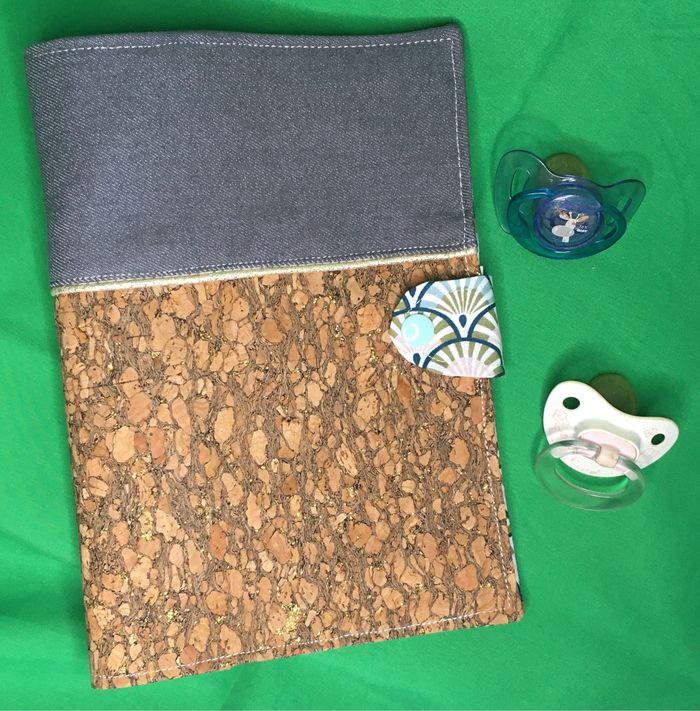 Protège carnet de santé Le bas est en liège et le haut est en jeans. L’intérieur est en coton Fermeture par pression Possibilité d’ajouter le prénom, offert, voir les propositions d’écriture et de couleur et m’envoyer un message avec le choix Tétine non inclus